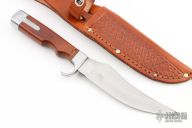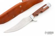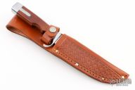 This Model #708 by Olsen Knives features a satin finished blade with notched thumbrest, .126" blade stock and 1.243" blade depth, hidden tang construction. The handle has an aluminum guard and butt with a dymondwood grip. Comes with a hand tooled brown leather sheath. Has some scratches, otherwise good condition.