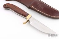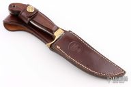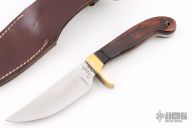This fixed blade from Olsen Knives features an upswept satin finished blade, .184" blade stock and 1.218" blade depth, full tang construction. The handle has a brass guard and dymondwood scales with a lanyard hole. Includes leather sheath with belt loop. Has some light scratches, otherwise excellent condition.