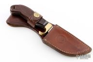 This knife by Olsen Knives features a satin finished blade with .178" blade stock and 1.444" blade depth, full tang construction. The handle has a brass guard and rosewood scales. Comes with a brown leather sheath. Has scratches, has been resharpened, otherwise good condition.