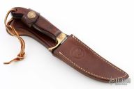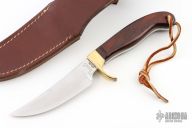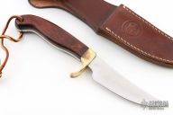 This knife by Olsen Knives features a satin finished blade with .183" blade stock and 1.111" blade depth, full tang construction. The handle has a brass guard and dymondwood scales. Comes with a brown leather sheath. Excellent condition.