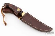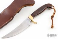 This knife by Olsen Knives features a satin finished blade with .175" blade stock and 1.189" blade depth, full tang construction. The handle has a brass guard and dymondwood scales. Comes with a brown leather sheath. Has some scratches, has been resharpened, otherwise good condition.