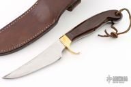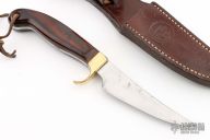 This knife by Olsen Knives features a satin finished blade with .153" blade stock and 1.100" blade depth, full tang construction. The handle has a brass guard and rosewood scales. Comes with a brown leather sheath. Has some scratches on the blade, has been resharpened, otherwise good user condition.
