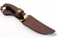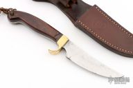 This knife by Olsen Knives features a satin finished blade with .173" blade stock and 1.109" blade depth, full tang construction. The handle has a brass guard and rosewood scales. Comes with a brown leather sheath. Has some scratches and pitting on the blade, otherwise good user condition.