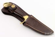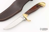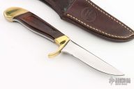 This knife by Olsen Knives features a satin finished blade with .182" blade stock and .826" blade depth, full tang construction. The handle has a brass guard and rosewood scales. Comes with a brown leather sheath. Has some light scratches, otherwise excellent condition.