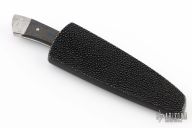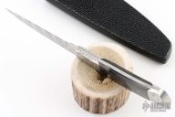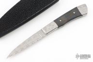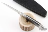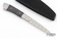 This "Gentle" by Ritsu Maruyama features an Odin's Eye Damasteel DS93X blade with .091" blade stock and .482" blade depth, full tang construction. The handle has matching dovetailed Damasteel bolsters, black/blue carbon fiber scales, polished screws. Comes with a black ray skin covered sheath. Comes with original box and COA dated 4/12/23. New condition. Comes with two extra handle screws. Very attractive little knife!