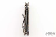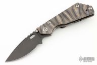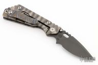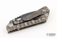 This PT by Mick Strider features a black blade with notched thumbrest and thumbhole. The handle has a Disruptive Strider Stripe finished titanium frame with matching tip up clip. New condition.