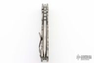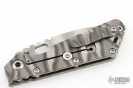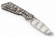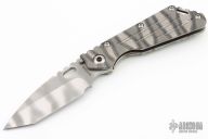 This Mick Strider Performance Series SMF framelock folder features a Ghost Stripe finished tanto blade with thumbhole and notched thumbrest. The handle has a Disruptive Strider Striped titanium frame with titanium clip, tip up carry. Jimping on blade spine. Includes Hinderer "Lock Bar Stabilizer" for maximum reverse lock retention. Nice detent, lockup and blade seating. New Condition.