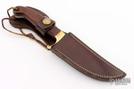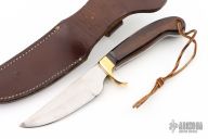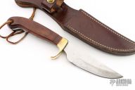 This knife by Olsen Knives features a satin finished blade with .175" blade stock and 1.210" blade depth, full tang construction. The handle has a brass guard and rosewood scales. Comes with a brown leather sheath. Has some scratches and has been resharpened, otherwise good condition.