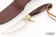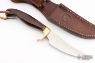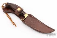 This knife by Olsen Knives features a satin finished blade with .155" blade stock and 1.110" blade depth, full tang construction. The handle has a brass guard and rosewood scales. Comes with a brown leather sheath. Has some light scratches, otherwise good condition.