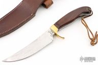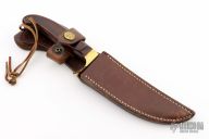 This knife by Olsen Knives features a satin finished blade with .179" blade stock and 1.189" blade depth, full tang construction. The handle has a brass guard and rosewood scales. Comes with a brown leather sheath. Has some light scratches and patina, the snap on the keeper of the sheath is broken, otherwise good condition.