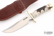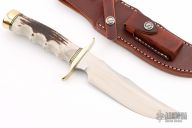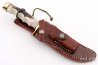 This model 4F by Randal Made Knives is a non-catalog model, it features a satin finished blade with a sharpened top edge, .235" blade stock and 1.385" blade stock, hidden tang construction. The handle has a brass double guard and butt, stag grip with finger grooves, black/brass spacers. Comes with a brown leather sheath and original paper wrapping. New from maker!