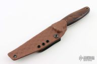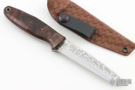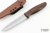 This Puukko Custom by Joe Watson features a triple temper/cryo 2-tone acid etch/satin finished drop point blade with "sharp corner spine", .099" blade stock and .936" blade depth, full tang construction. The handle has pinned stabilized claro walnut scales. Comes with a kydex sheath with belt loop. Comes with pouch and maker's card. New from maker!