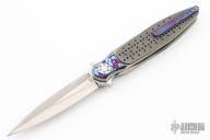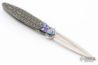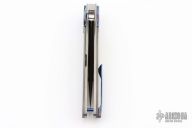 This "B.A.D." Blue Mod by Merriken Knives features a satin finished double edged blade with notched flipper. The handle has timascus bolsters, bead blasted titanium scales with hole pattern, orange peel finished titanium liners, custom pivot screws, anodized titanium screws, timascus tip up clip with hidden screws. Comes with original box, custom copper pivot tool, and COA dated 8-27-19. Also includes original blue anodized bolsters, zirconium clip and Custom clip/bolster upgrade card dated 3/7/2020 signed by Merriken. Rides on bearings, nice detent, lockup and blade seating. Excellent condition.