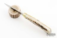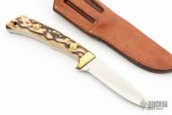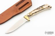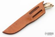 This fixed blade from by Jimmy Lile features a satin finish drop point blade with .137" blade stock and .856" blade depth. The handle is comprised of brass guard, pins and lanyard tube with stag scales over full tang construction. Comes with a brown leather sheath. Excellent condition.