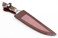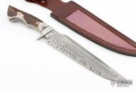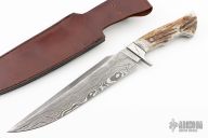 This Bowie by SMID Damascus features a polished Damascus blade with false top edge, .191" blade stock and 1.883" blade depth, full tang construction. The handle has integral Damascus bolsters, stag scales, and mosaic pins. Comes with a leather sheath with inlay. New from maker!