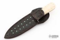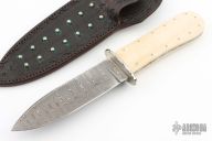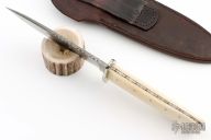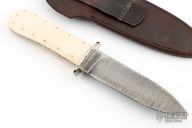 This knife by CJ Deubel features a Devon Thomas Ladder Pattern Damascus blade with fileworked spine, .140" blade stock and 1.267" blade depth, full tapered tang construction. The handle has a nickel silver guard with fileworked edges, giraffe bone scales with nickel silver pins, fileworked tang. Comes with a hand tooled black leather sheath. Excellent condition.