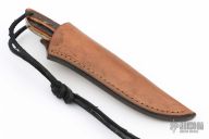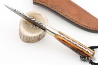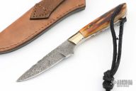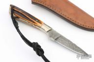 This knife features a Damascus blade with fileworked spine and notched thumbrest, .132" blade stock and .719" blade depth, full tang construction. The handle has nickel silver bolsters and stag scales, fileworked tang. Comes with a hand tooled brown leather sheath. Excellent condition.