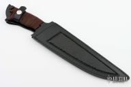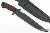 This Knife by MA Knives features a black finished clip point blade with a false top edge, .153" blade stock and 1.871" blade depth, full tang construction. The handle is wraped with lanyard hole. Comes with a brown leather sheath with inlay. New from maker.