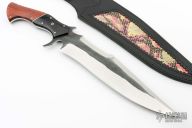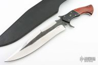 This Knife by MA Knives features a large clip point blade with a false top edge, .180" blade stock and 2.381" blade depth, full tang construction polished spine and belly. The handle has g10 bolsters, wood grip with lanyard hole. Comes with a brown leather sheath with inlay. New from maker.