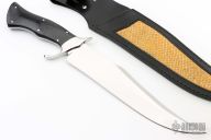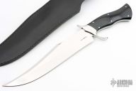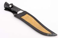 This Knife by MA Knives features a mirror polish clip point blade with a false top edge, .170" blade stock and 1.871" blade depth, full tang construction. The handle has a steel guard, and pinned g10 grip. Comes with a brown leather sheath with inlay. New from maker.