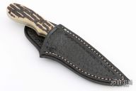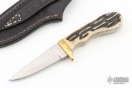 This knife has a satin finished blade with notched thumbrest, .132" blade stock and .881" blade depth, full tang construction. The handle has a brass guard and jigged bone scales. Comes with a hand tooled black leather sheath marked CT on the back. Has some light scratches, otherwise good condition.