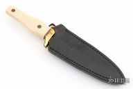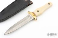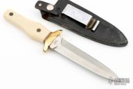 This Model 2750 Dagger from Ka-Bar features a satin finished double edged blade with .134" blade stock and 1.040" blade depth, hidden tang construction. The handle has a brass guard with a ivory colored composite handle with brass engraved pins. Includes a black leather boot sheath with clip. Has a couple light scratches, has small cracks in the grip, otherwise good condition.
