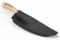 This knife features a hand forged blade with acid etched texture on the blade, .106" blade stock and 1.447" blade depth, full tang construction. The handle has aluminum bolsters and stag scales. Comes with a black leather sheath. Has some oxidation spots, has a rustic look, otherwise good condition.
