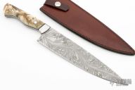 This Knife by SMID Damascus features a Snake Feather Damascus blade with .1379" blade stock and 1.830" blade depth, full tang construction. The handle has stainless bolsters, black liners, and carved camel bone scales. Comes with a brown leather sheath with inlay. New from maker!