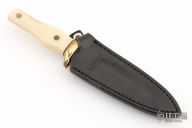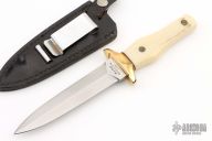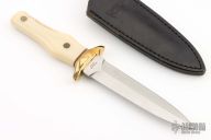 This Model 2750 Dagger from Ka-Bar features a satin finished double edged blade with .146" blade stock and 1.028" blade depth, hidden tang construction. The handle has a brass guard with a ivory colored composite handle with brass engraved pins. Includes a black leather boot sheath with clip. Has a couple light scratches, has small cracks in the grip, otherwise good condition.
