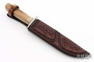 This bowie features a mirror polished blade with false top edge, .174" blade stock and 1.323" blade depth, full tang construction. The handle has a stainless steel guard and stag scales. Comes with a hand tooled brown leather sheath by Treestump Leather. Has been resharpened, the handle is a little rough and this knife may have been rehandled to its current condition. Has some scratches, good condition otherwise.