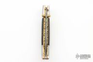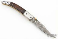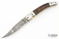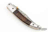 This linerlock by SMID Damascus features a Mosaic Damascus blade with brass thumbstuds and fileworked spine. The handle has german burl wood inlays, polished front/rear bolsters, fileworked brass liners and a fileworked stainless steel backspacer. Nice blade seating and lockup. Comes with leather belt sheath. New from maker!