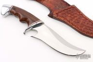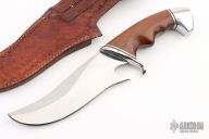 This knife by Bill Claw features a mirror polished blade with false top edge, .153" blade stock and 2.098" blade depth, hidden tang construction. The handle has a stainless steel guard, wood grip with brown and aluminum spacers, aluminum butt. Comes with a hand tooled brown leather sheath. Has some light scratches, otherwise excellent condition.