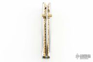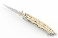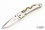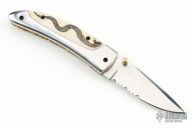 This linerlock by MA Knives features a stainless blade with partial serrations and brass thumbstuds. The handle has scrimshaw bone inlays, stainless scales, file worked brass liners and a fileworked stainless steel backspacer. Nice blade seating and lockup. Comes with leather belt sheath. New from maker!
