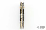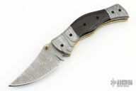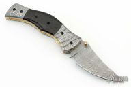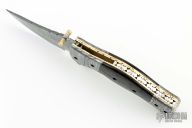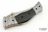 This linerlock by SMID Damascus features a Damascus blade with file worked blade spine and brass thumbstuds. The handle has Damascus front/rear bolsters, wood inlays, file worked brass liners and a fileworked stainless steel backspacer. Nice blade seating and lockup. Comes with leather belt sheath. New from maker!