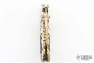 This linerlock by MA Knives features a stainless blade with file worked blade spine and brass thumbstuds. The handle has polished steel bolsters, scrimshaw bone scales, file worked brass liners and a fileworked stainless steel backspacer. Nice blade seating and lockup. Comes with leather belt sheath. New from maker!