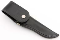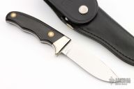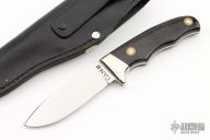 This knife by CAMIII features a mirror polished blade with .144" blade stock and 1.117" blade depth, full tang construction. The handle has nickel silver bolsters, black linen micarta scales with red liners. Comes with a black leather sheath. Has a couple light scratches, otherwise excellent condition.