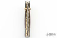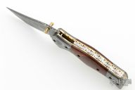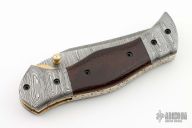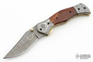 This linerlock by SMID Damascus features a Damascus blade with file worked blade spine and brass thumbstuds. The handle has Damascus front/rear bolsters, wood inlays, file worked brass liners and a fileworked stainless steel backspacer. Nice blade seating and lockup. Comes with leather belt sheath. New from maker!