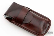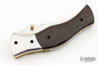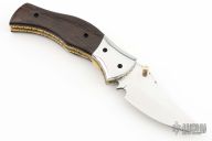 This linerlock by MA Knives features a stainless blade with file worked blade spine and brass thumbstuds. The handle has polished steel bolsters, wood scales, file worked brass liners and a fileworked stainless steel backspacer. Nice blade seating and lockup. Comes with leather belt sheath. New from maker!