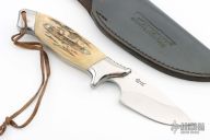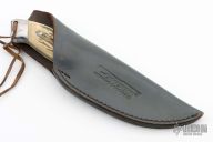 This Model 80-S by Condor USA features a satin finished drop point blade with .189" blade stock and 1.389" blade depth, hidden tang construction. The handle has stainless steel bolsters and stag scales. Comes with a grey leather sheath. Has some scratches, has been resharpened, otherwise good condition.