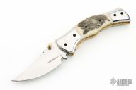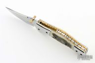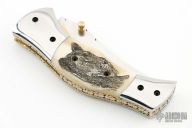 This linerlock by MA Knives features a stainless blade with file worked blade spine and brass thumbstuds. The handle has polished steel front/rear bolsters, scrimshaw bone scales, file worked brass liners and a fileworked stainless steel backspacer. Nice blade seating and lockup. Comes with leather belt sheath. New from maker!