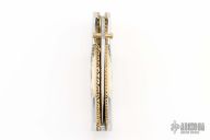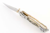 This linerlock by MA Knives features a stainless blade with file worked blade spine and brass thumbstuds. The handle has polished steel front/rear bolsters, scrimshaw bone scales, file worked brass liners and a fileworked stainless steel backspacer. Nice blade seating and lockup. Comes with leather belt sheath. New from maker!