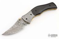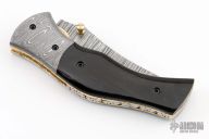 This linerlock by SMID Damascus features a Damascus blade with file worked blade spine and brass thumbstuds. The handle has Damascus bolsters, buffalo horn scales, file worked brass liners and a fileworked stainless steel backspacer. Nice blade seating and lockup. Comes with leather belt sheath. New from maker!