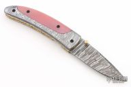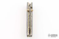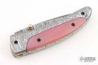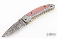 This linerlock by SMID Damascus features a Damascus blade with file worked blade spine and brass thumbstuds. The handle has Damascus scales, dyed bone inlays, file worked brass liners and a fileworked stainless steel backspacer. Nice blade seating and lockup. Comes with leather belt sheath. New from maker!