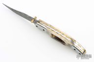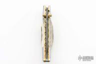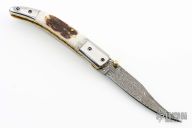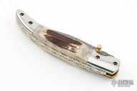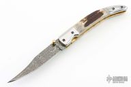 This linerlock by SMID Damascus features a Mosaic Damascus blade with brass thumbstuds and file worked spine. The handle has stag inlays, polished front/rear bolsters, fileworked brass liners and a fileworked stainless steel backspacer. Nice blade seating and lockup. Comes with leather belt sheath. New from maker!