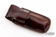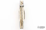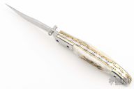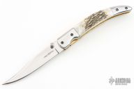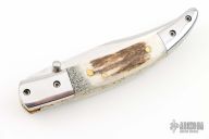 This linerlock by MA Knives features a stainless blade with file worked blade spine and steel thumbstuds. The handle has polished steel bolsters, pinned stag scales, file worked brass liners and a fileworked stainless steel backspacer. Nice blade seating and lockup. Comes with leather belt sheath. New from maker!