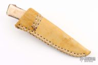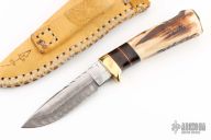 This knife by Hyrum Hunter features a multi-bar Damascus blade with fileworked spine, .233" blade stock and 1.149" blade depth, hidden tang construction. The handle has a brass guard and butt, Artifact fossil walrus ivory grip with black/red/brass/ironwood spacers. Comes with a leather sheath. Has a couple small spots on the Damascus, otherwise excellent condition.