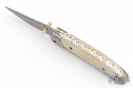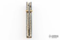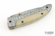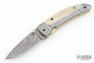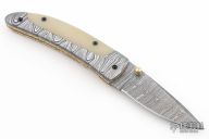 This linerlock by SMID Damascus features a Damascus blade with file worked blade spine and brass thumbstuds. The handle has Damascus scales, bone inlays, file worked brass liners and a fileworked stainless steel backspacer. Nice blade seating and lockup. Comes with leather belt sheath. New from maker!