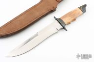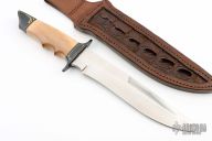 This knife by Jim Minnick features a hand rub satin finished blade with a false top edge, .261" blade stock and 1.633" blade depth, hidden tang construction. The handle has a blackened steel guard with engraving and 24kt gold inlays, matching butt, fossil walrus ivory grip. Comes with a brown leather zippered case with alligator skin inlay, and a zippered case. Excellent condition.