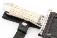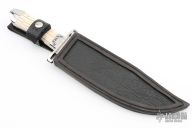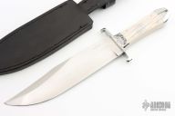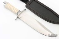 This Bowie by Edward Kalfayan features a hand rub satin finished blade with false top edge, .250" blade stock and 2.005" blade depth, full tang construction. The handle has an engraved stainless steel guard, walrus ivory scales, stainless steel rear bolsters. Comes with a black leather sheath. Has some light scratches, otherwise excellent condition. Comes with a zippered case.