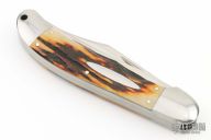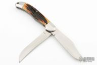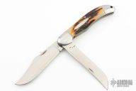 This Two-Blade Trapper by Bill Ruple features hand rub satin finished blades with nail nicks. The handle has stainless steel bolsters, jig bone covers with stainless steel liners and springs. Half stop blade positioning on both blades, flush in all positions. Has a few scuffs and scratches otherwise the knife is in good condition.